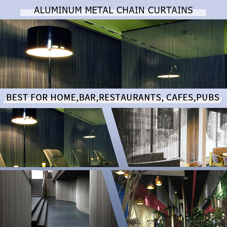 Aluminum Double Hook Metal Chain Curtains is also called aluminum chain curtain,chain fly screen, Chain link curtain. It is produced of 100% aluminum materials and has excellent quality. The product has the characteristics of durable, gorgeous and high-end, high technology content, etc. And it also has the advantages of lightweight,simple structure and convenient installation.It is relative to the iron curtain, chain mail curtain, is more in line with the preferences of the new era.It applied to various occasions, purposes, highlighting the elegant temperament, extraordinary personality, and noble taste.